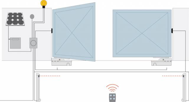 Sestava pro dvoukřídlou bránu - podzemní pohony 24V, šířka křídla do 2,3 m, hmotnost do 400 kg (závisí na délce křídla), úhel otevření max. 180°, mechanické odblokování při výpadku napájení.